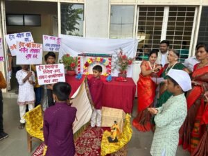 हुंडाबळी आणि स्त्रीभ्रूणहत्या याविरुद्ध प्रबोधनासाठी लोकसेवा इंग्रजी माध्यम आयोजित बाहुला बाहुली विवाह प्रसंगी शाळेतील विद्यार्थी