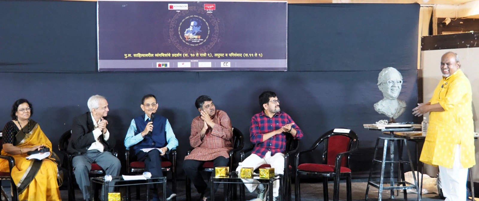 परिसंवादात सहभागी झालेल्या मान्यवरांशी डॉ. मंदार परांजपे यांनी संवाद साधला. बालगंधर्व कलादालनात कार्यक्रमाचे आयोजन करण्यात आले होते. ‘आस्वादक पुलं’ उलगडत असताना प्रमोद कांबळे यांनी पुलंचे मोहक शिल्प साकारले.